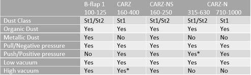 Para selecionar a válvula adequada, devem ser compreendidos vários parâmetros, começando pelo tipo e dimensão do sistema que será instalado. A Nederman oferece uma das maiores gamas de coletores de pó do mercado, com o objetivo de atender a quase todas as aplicações de poeiras combustíveis, o que requer a disponibilidade de válvulas EIF para responder às diferentes necessidades. Conforme a extração é efetuada por meio de um sistema de alto ou baixo vácuo, com pressão negativa (sugando) ou sistema de pressão positiva (soprando), no interior ou no exterior, a Nederman possui soluções de sistemas de poeiras combustíveis e válvulas EIF para atender à aplicação necessária. Confira a tabela abaixo.