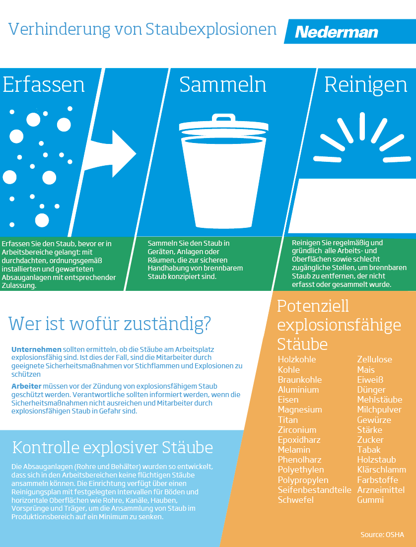 Da die Stäube der meisten organischen Materialien und synthetischen Materialien und Metalle explodieren können, muss auf die Vermeidung von Staubexplosionen geachtet werden. Die Europäische Union hat zwei Richtlinien über explosionsfähige Atmosphären / brennbaren Staub verabschiedet (ATEX-Richtlinien).