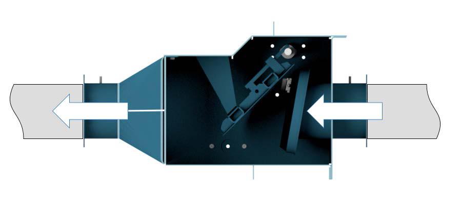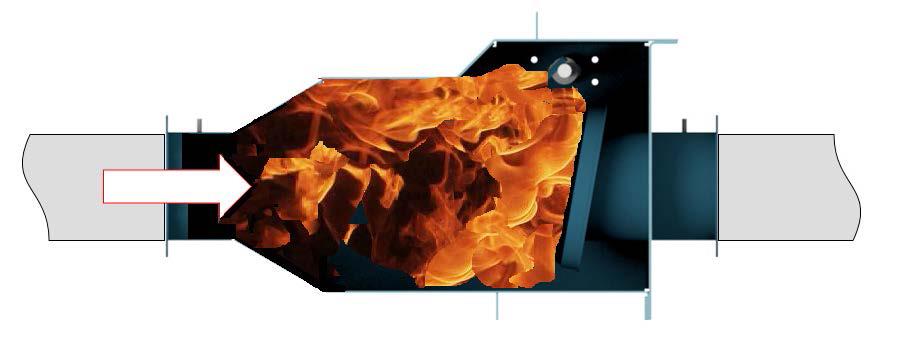 During normal operation, the valve is kept open, and large opening angle ensure low pressure drop. In case of an explosion in the filter, the pressure wave will force to close the flap plate and lock in position. When flap plate is closed it makes an effective barrier against approaching flame front. This prevent the explosion from being transmitted from the filter to upstream work areas.