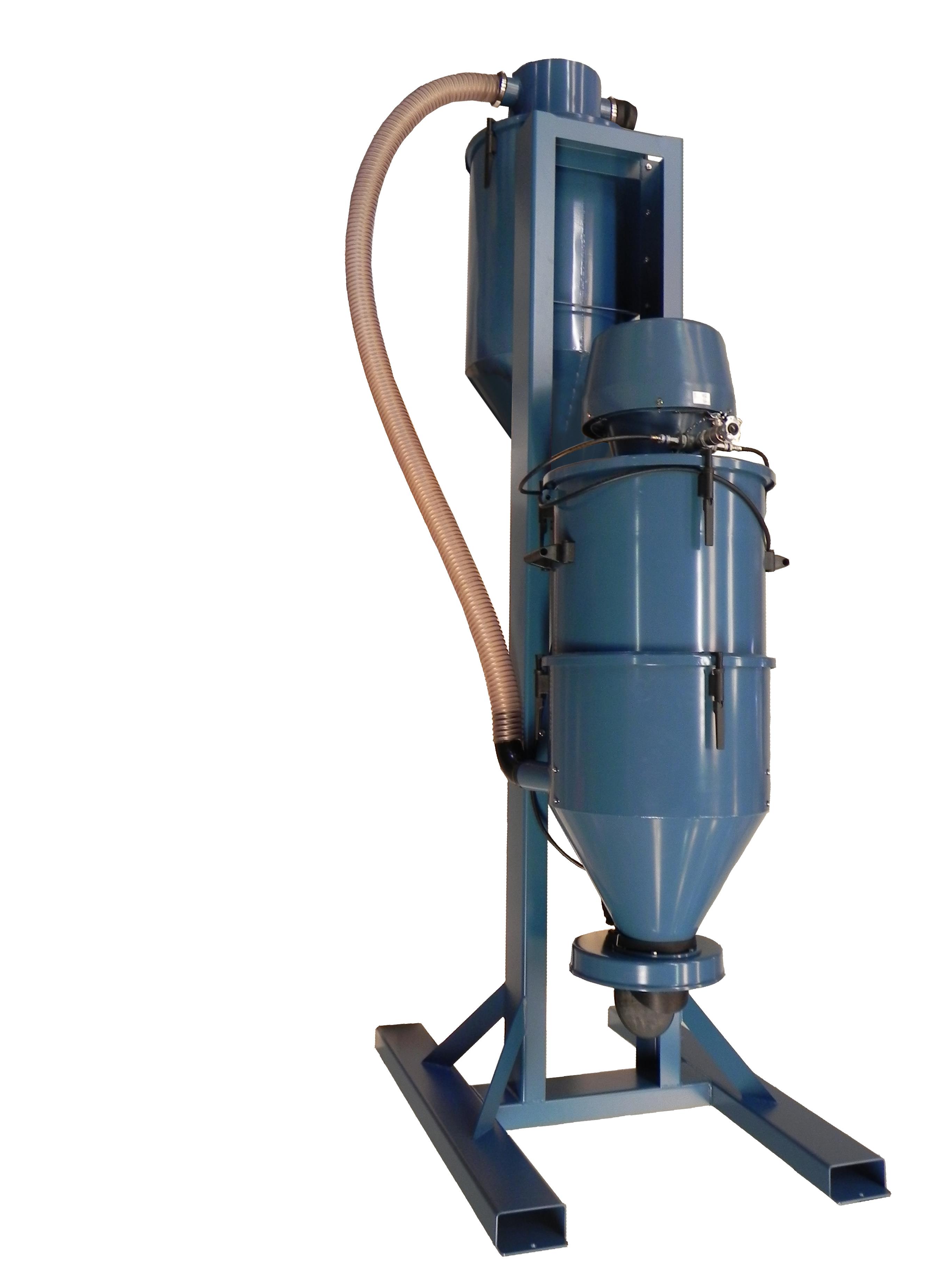 An extremely powerful vacuum unit for the collection of blasting grit and other granulated material. The combination of high vacuum and high airflow make material transport over long distance possible. Compact design, built on a frame with the possibility of transportation by forklift. Equipped with grit and dust separator. The clean grit is collected in a silo and can be re-used. The dust is trapped in a high efficient NCF filter and discharged into a dustbin or bag.