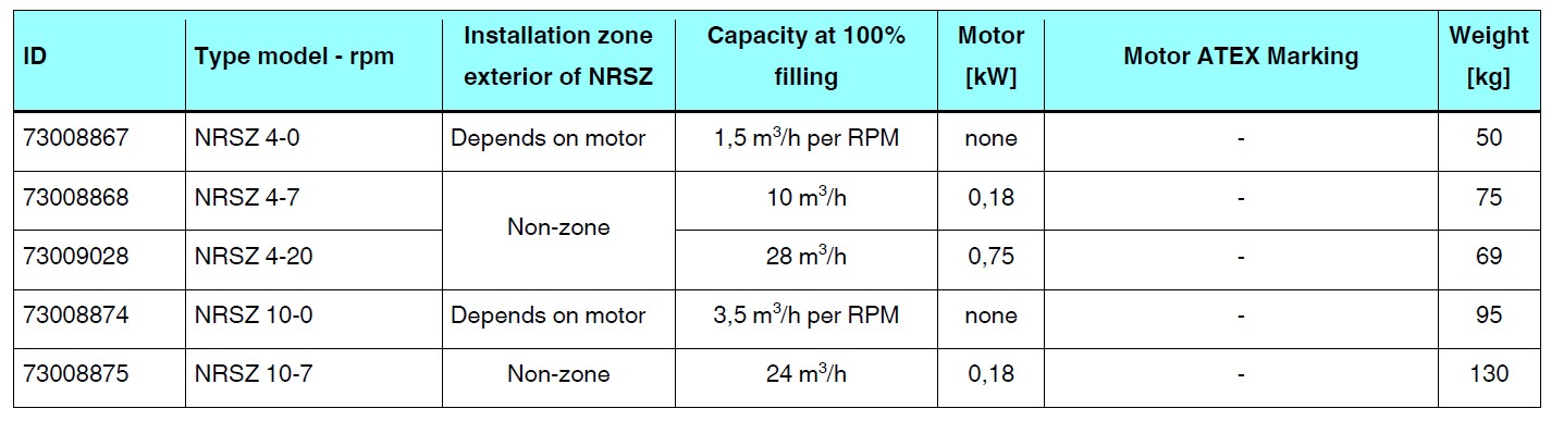 "La válvula rotativa de tipo NRSZ se utiliza para transportar material entre dos sistemas separados. En los sistemas de transporte neumático generalmente se requiere la descarga del filtro o ciclón al silo, a presión atmosférica. Esta es una aplicación ideal para la válvula rotativa tipo NRSZ.La válvula rotativa se puede usar para la mayoría de los tipos de materiales, aunque el tamaño de partícula no debe exceder 13 x 13 x 13 mm.La válvula rotativa tipo NRSZ es modular y robusta construida en placa de acero . El rotor de cada módulo está equipado con un embrague elástico. Esto reduce la posibilidad de daños durante el uso y maximiza la vida útil de la unidad. El rotor tiene sellos de goma especiales, que proporcionan un bloqueo de aire efectivo entre la entrada y la salida.Este tipo de válvula rotativa es una versión certificada para polvos explosivos tipo St1 y St2. La válvula NRSZ es un sistema de protección según definición ATEX.Los polvos explosivos tipo St1 pueden tener Kst hasta 200 bar m / s.Los polvos explosivos tipo St2 pueden tener Kst hasta 300 bar m / s."