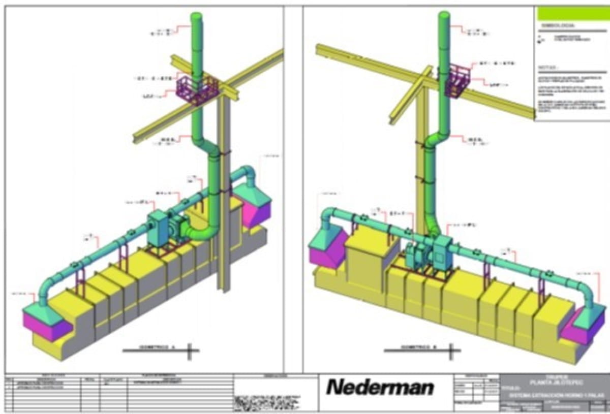 Nederman proporcionó una solución que consistió en la instalación de un sistema de extracción y filtración para el horno de revenido; que consiste en memorias de cálculo, ingeniería de fabricación e instalación, ventilador, campanas de extracción, tubería para chimeneas en lámina galvanizada calibre 14, plataforma de servicio, arranque, pruebas de equipo y comisionamiento.