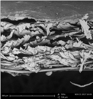 | Image 1 Vue du dessus du filet en nanofibres | Image 2 Vue latérale, nanofibre sur papier mélangé 80/20 |