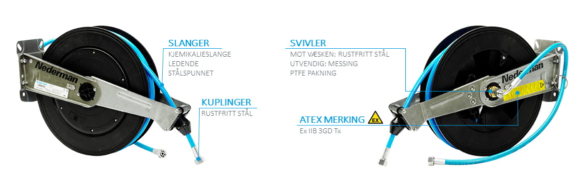 Nederman har jobbet med industrielle slangetromler i flere tiår, og vet hvordan man lager tromler som gir deg et brukervennlig produkt som varer i mange år. De nye slangetromlene for bruk med aggressive medier er utviklet i henhold til spesifikke bruksområder. Noe som forlenger levetiden til produktet og dermed reduserer drifts og vedlikeholdskostnader. Produktene er også sertifisert for områder med eksplosjonsrisiko for å oppfylle sikkerhetsforskriften.