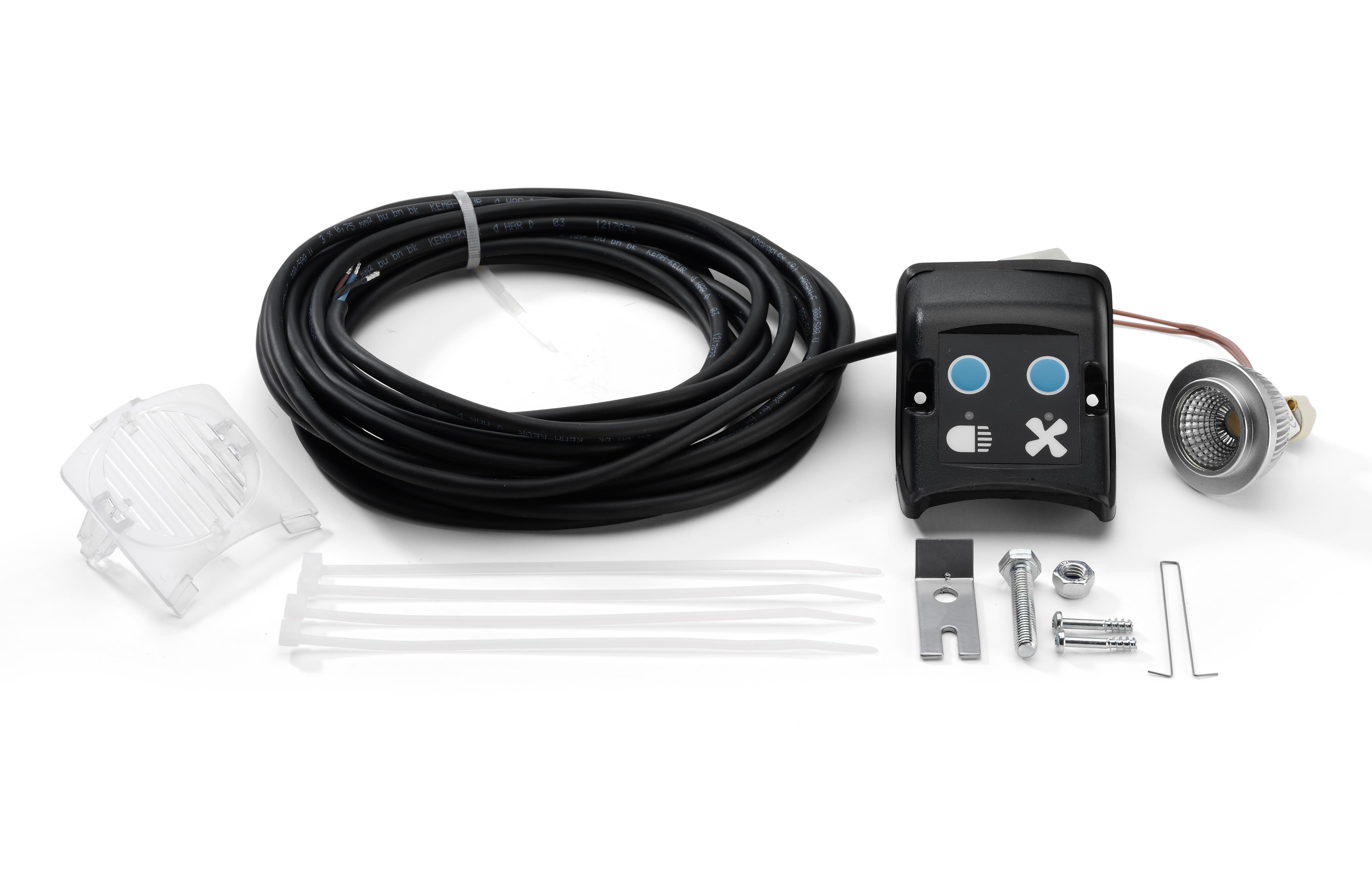 LED light/fan switch for Original hood. Including: LED 24V, cable, switch, socket, lens, screws, nuts, cable straps, spring
